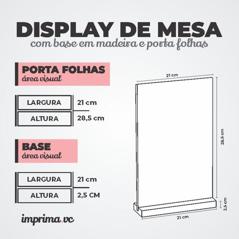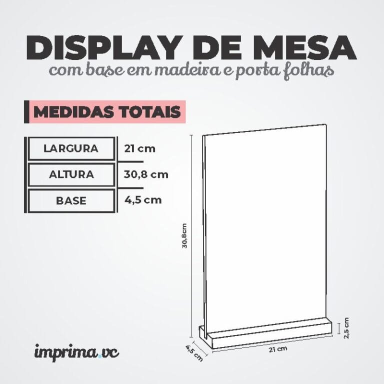 Display de mesa com base em madeira e porta folhas em acrílico, com indicação do espaço que pode ser personalizado pela Imprima.vc